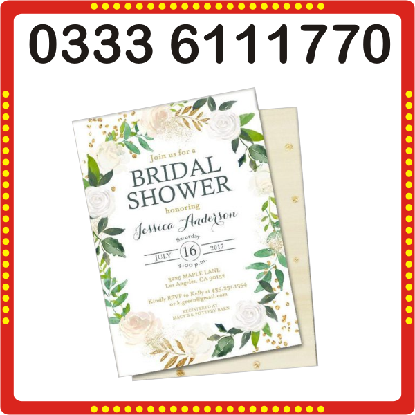 Best and High Quality Bridal Shower Invitation Cards Printing Service in Pakistan, Order Now Bridal Shower Invitation Card Online, Home Delivery Service Also Available For Bridal Shower Invitation Cards Printing, TCS Delivery Charges is Rs 300/kg For All Pakistan, Contact Us on Whatsapp and Get Free Design For Your Bridal Shower Invitation Cards, Submit Order Online.